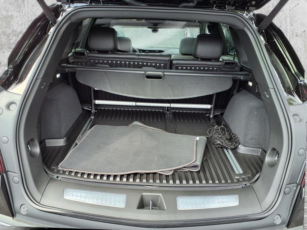 - Opens or closes when the system senses the key fob and the driver extends their foot under the left-hand side of the rear bumper over an image of the Cadillac Crest projected under the vehicle